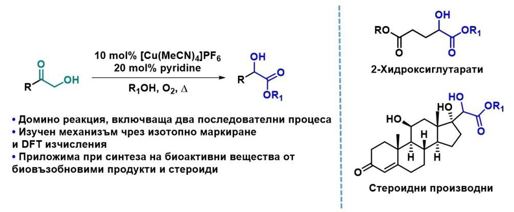 Изследователии от Института по органична химия с Център по фитохимия са разработили мед-катализирана тандемна реакция, превръщаща α-хидроксикетони в ценни α-хидроксиестери. Биовъзобновимите метил- и етил-5-хидроксилевулинати могат да се превърнат в серия ценни за практиката, несиметрични диестери на 2-хидроксиглутаровата киселина с добри добиви. 2-Хидроксиглутаратът притежава кардиозащитни, нефрозащитни и антиастматични свойства, а също така е и онкометаболит и намира приложение като биомаркер при мониторинг на ракови заболявания, а методът се използва и за модификации на стероидни молекули като кортизон, хидрокортизон, преднизон и преднизолон, притежаващи аналгетични и противовъзпалителни свойства.